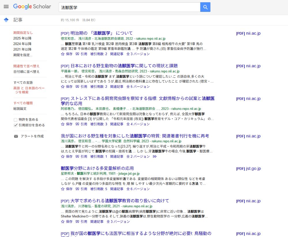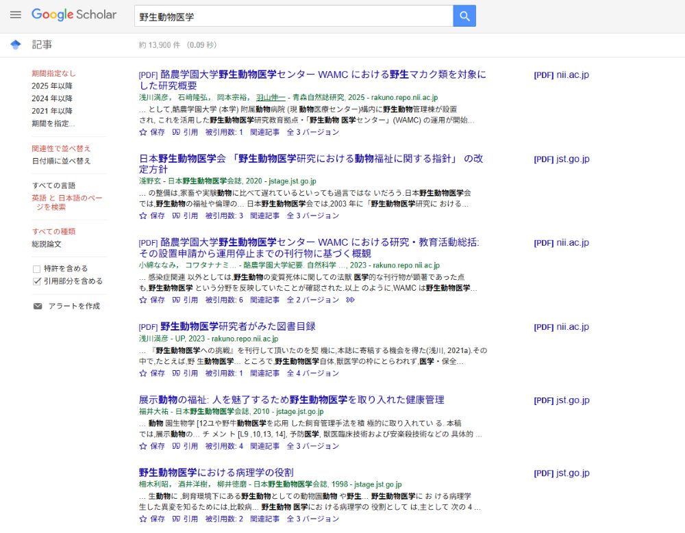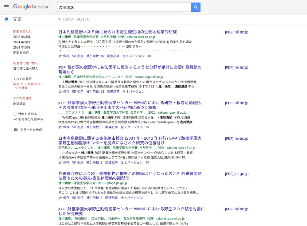 もし、興味のある研究をしている大学があるのなら、そこです! 研究実績の調査は、前述した検索法が参考になります。たとえば、いくつかの獣医大で、何となく興味がありそうな分野の獣医大教員の名前で検索をしてみましょう。試しに私の名前でやってみます(以下、画像3まで2025年9月17日検索)
