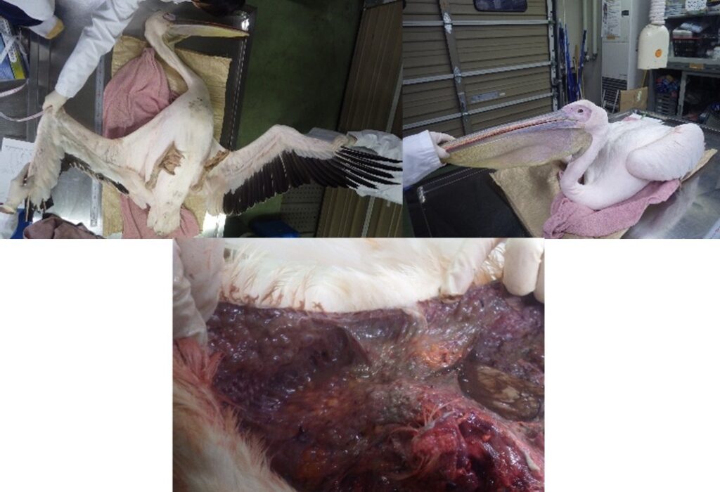 イメージを持っていただきたいのでサギ類を対象にした画像を探しましたが、適当なものがありませんでした。水鳥例として、私が創設・運営した酪農学園大学野生動物医学センターに運ばれたペリカン(サギの所属分類と同じペリカン目)を紹介します。