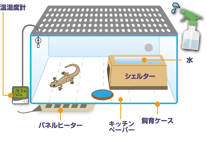 日本に生息するヤモリなので温度幅はある程度あっても平気ですが、25度前後が最も活発に活動します。飼育下で冬眠させることは難しいので、パネルヒーターを使用して越冬させる方が無難です。パネルヒーターを使用する場合は全面に敷くのではなく、涼しいところも作ってヤモリが自分で調節できるようにしましょう。