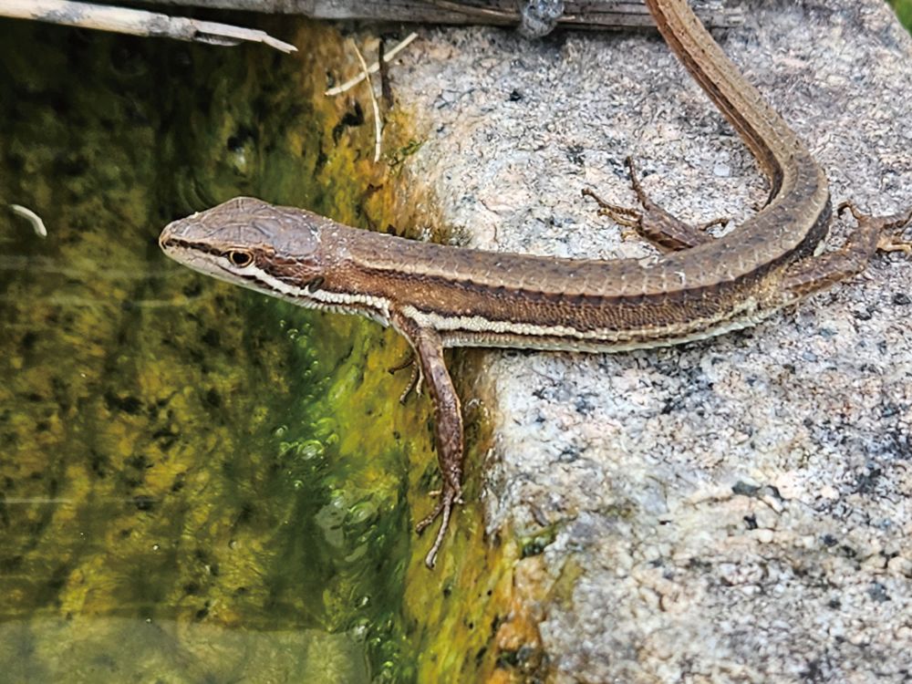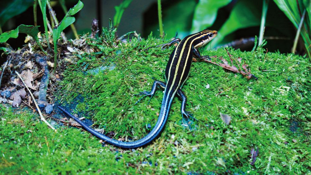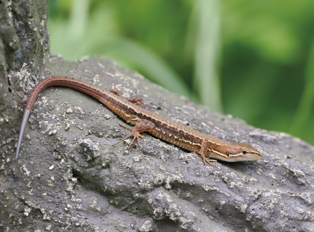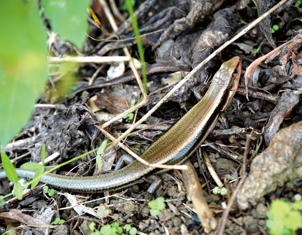 ニホントカゲは、北海道~九州のほぼ全域に分布している爬虫類です。平地から標高の高い山地まで生息し、石垣や草むら、土手、藪などでよく見られます。