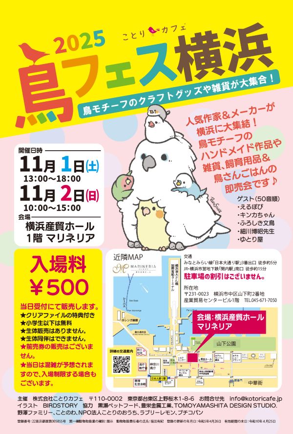 ことりカフェは、横浜産貿ホール マリネリアにて、「鳥フェス横浜」を2025年11月1~2日に開催します。