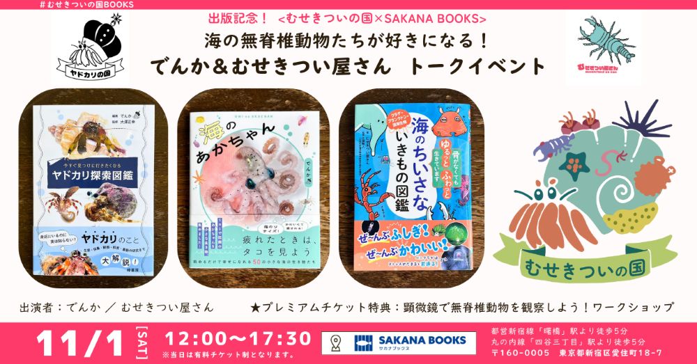 同イベントは、でんかさんが執筆した書籍『今すぐ見つけに行きたくなるヤドカリ探索図鑑』(緑書房、2025年)『海のあかちゃん』(ワニブックス、2025年)と、むせきつい屋さんさんが執筆した『海のちいさないきもの図鑑』(西東社、2025年)の出版を記念したトークイベントです。