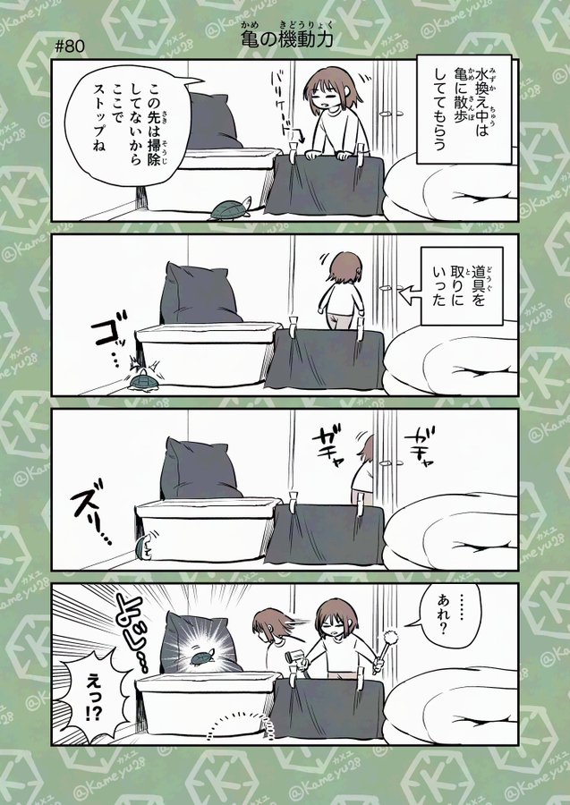 そんな亀との生活をリアルに描いた4コマ漫画が、SNSを中心に注目されています。