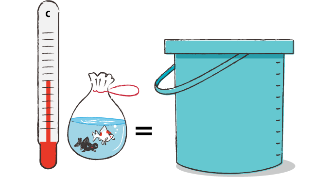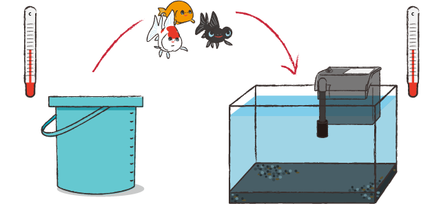 水温が急激に変化すると、金魚に大きなストレスがかかります。金魚が入った容器に少しずつ作った飼育水を入れ、水温を近づけてあげましょう。