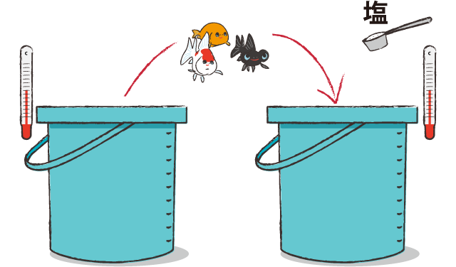 塩水浴中は、2日に1回水を入れ替えます。この時も、水温が変化しないように気を付けましょう。