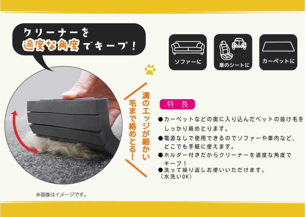同製品は、電源無しで使用でき、カーペットなどの奥に入り込んだペットの抜け毛をしっかり絡め取る抜け毛クリーターです。