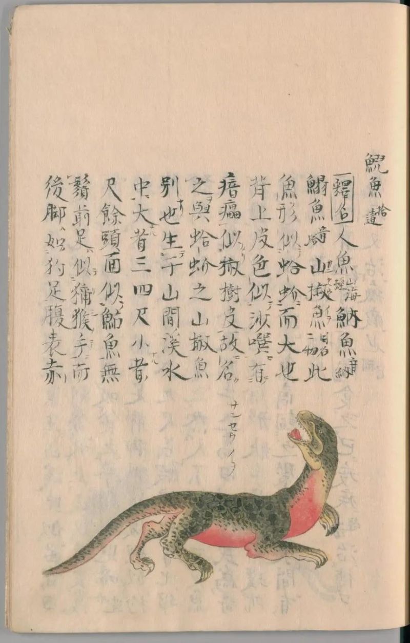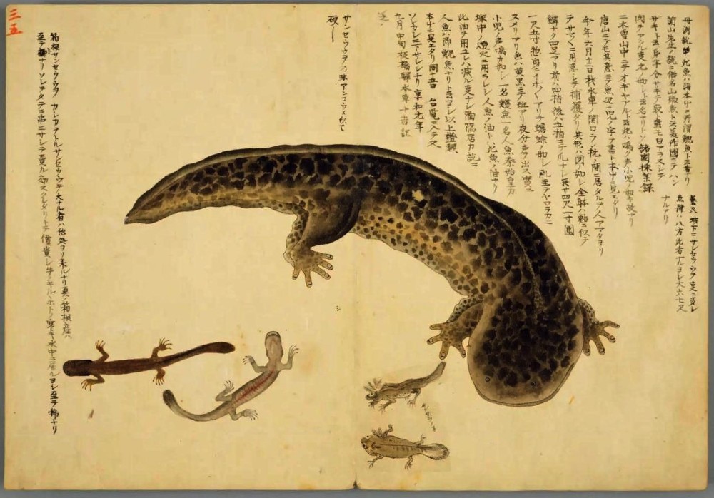 一方、江戸で生活している多くの人々にとって、オオサンショウウオは見馴れないいきものでした。18世紀前半に作られた日本最初の魚類図鑑といわれる『日東魚譜』によれば、天和年間(1681~1684)に、武州牛込(東京都新宿区)の高田川に大きさ3尺余り(約90.9センチメートル)のオオサンショウウオが現れたところ、人びとが集まり殺してしまったという記述が見えます。オオサンショウウオといういきものへの理解は、まだごく一部の人びとに限られていたようです。