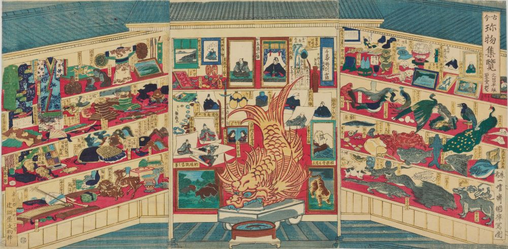 関東では見馴れないオオサンショウウオが見世物となる事例が増えていきますが、江戸時代を通していきものへの理解・関心が深まっていくなかで、オオサンショウウオへの認識に変化が生じていったように思われます。そして、明治5(1872)年3月より湯島聖堂大成殿(東京都文京区)で催された博覧会では、金のシャチホコの前に展示されることになりました。