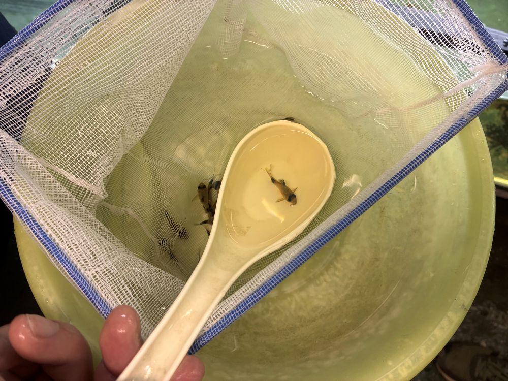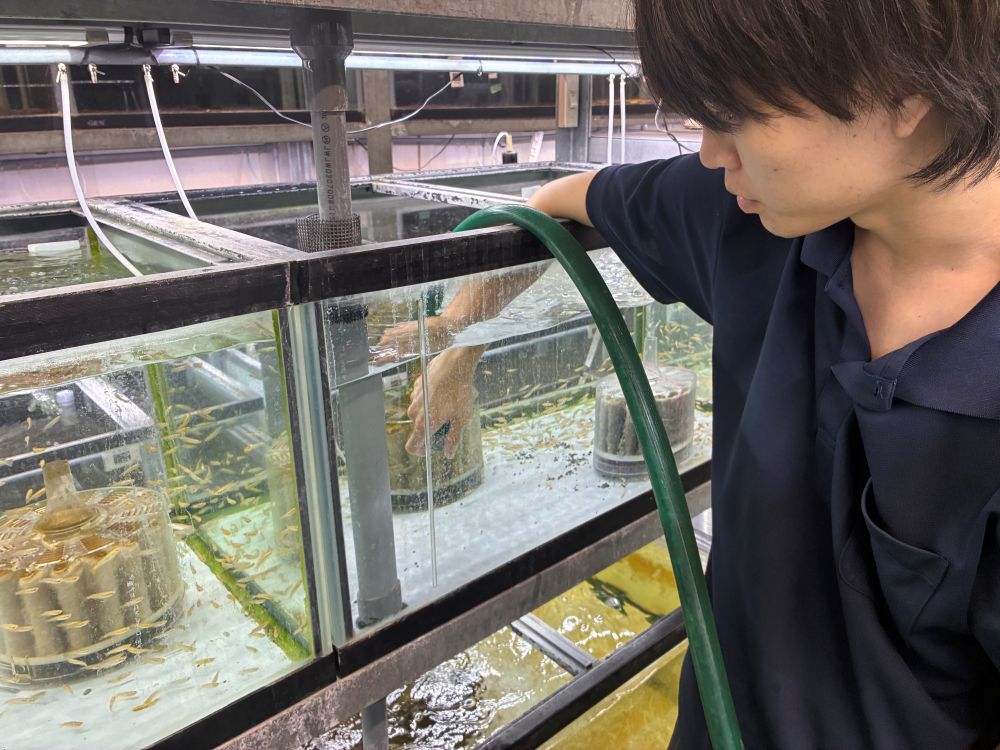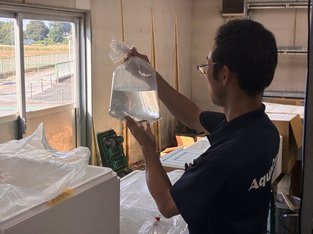 出荷の前に生体の状態を確認する際は、一匹一匹手作業で行っており、その様子も見せていただきました。