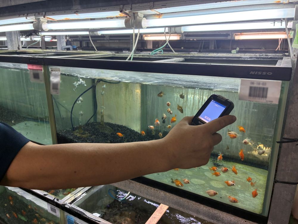 在庫数やストック場所は、生体問屋では珍しいシステムを導入して生体をデータで管理しているそうです。水槽バーコード(水槽右)と生体バーコード(水槽左)をスキャンすることで、生体をストックする水槽の場所を登録して誰でも把握できるようにしていると教えていただきました。