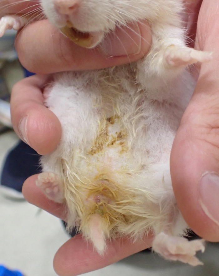 初期症状では途切れ途切れに排せつされ、血尿と間違えられることが多いですが、ハムスターは犬や猫とは異なり生殖器と泌尿器の開口部が別のため、よく観察することで分泌液が生殖器から排せつされていることが確認できます。