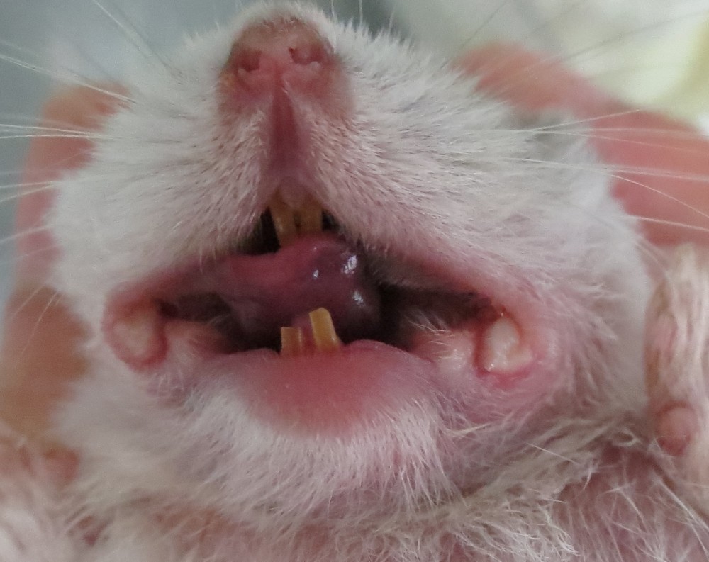 嗜好性の変化や食欲不振、体重減少、被毛粗剛、流涎などの症状がみられますが、症状がないこともあります。重度の場合は上顎切歯が口腔内側に湾曲し、口腔と皮膚を貫通して頰側に突出していることもあります。