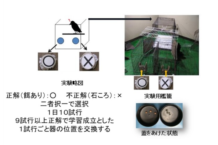 この二つの容器をカラスに自由に選択させ、記号と餌が関連していることを学習するまでの日数(学習速度)を測定して比べました。1日10回実験し、9回成功すると学習成立(覚えた)としました。