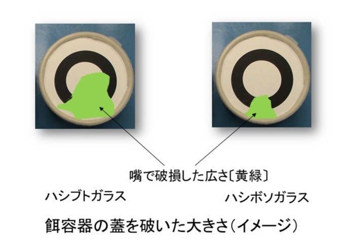 また、餌容器の紙蓋を突き破るときも、身を引きながら恐る恐る首を突き出してつついていました。嘴で蓋を破った痕跡を比べると、ハシボソガラスの破り跡ははるかにハシブトガラスのそれより小さかったのです。