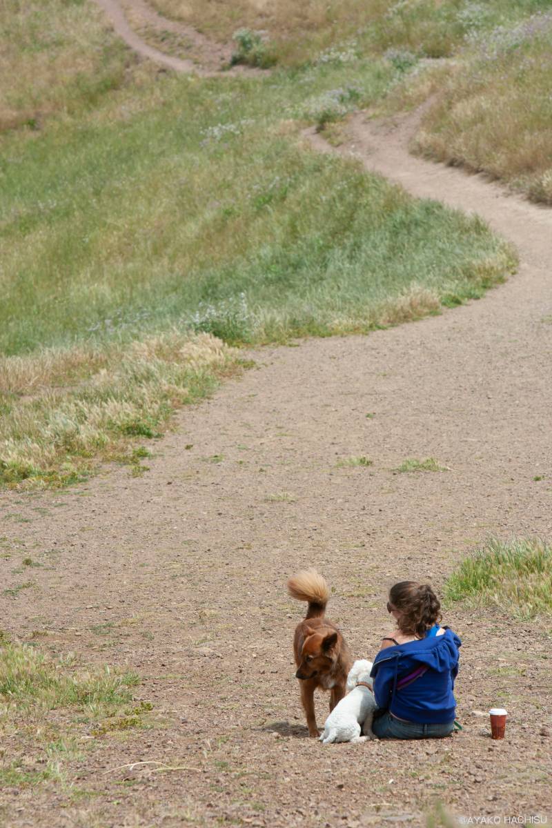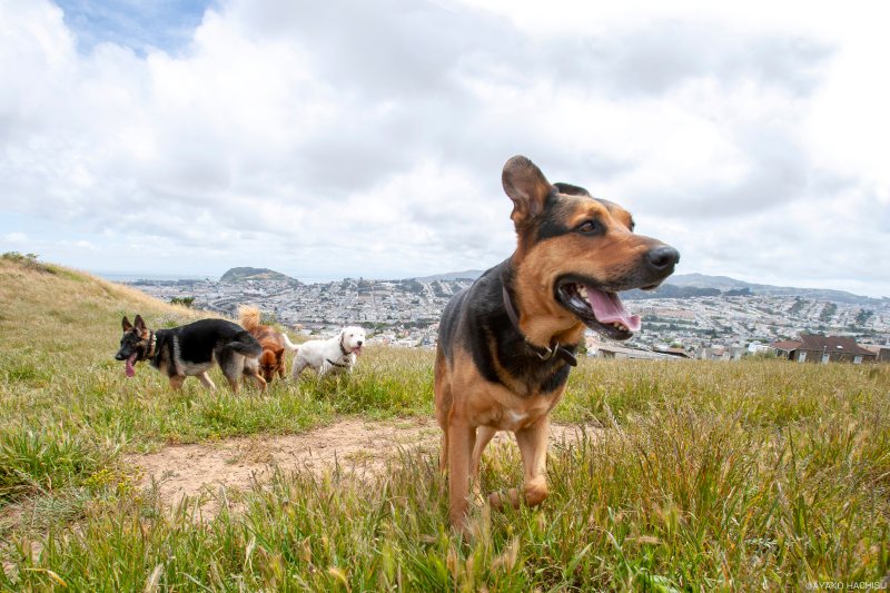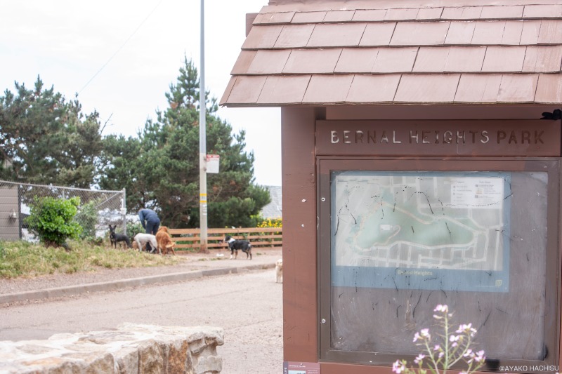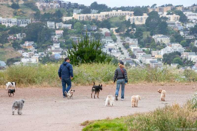 非常に興味深かったため、彼らと犬たちを追うように、ゆっくりとウォーキングを始めました。緩やかな丘をアップダウンしながらサンフランシスコの街並みを眺めたり、犬同士が遊んでいる様子や犬と一緒に休憩している飼い主の姿、さらには初めて出会う犬たちから「おもちゃを投げて!」と催促され、このエリアの住人になったような気分になりました。