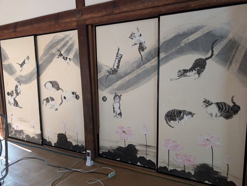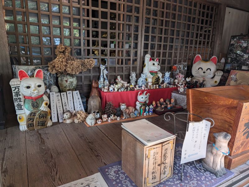 生善院は、猫伝承の中でも古い歴史を持つ猫寺の一つです。境内は猫だらけ。庭やふすまはもちろん、境内に祀られた猫地蔵や奉納品まで猫だらけです。猫伝承の存在を確かに感じさせます。