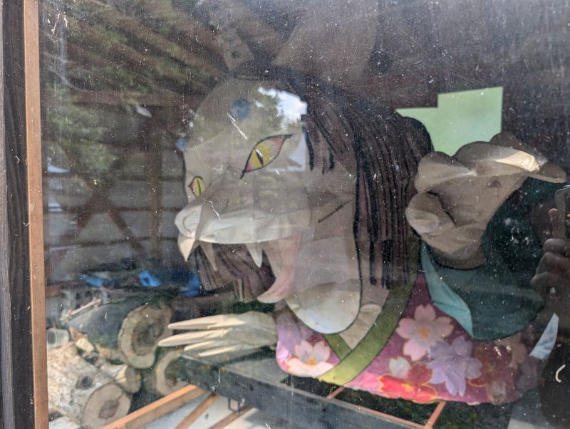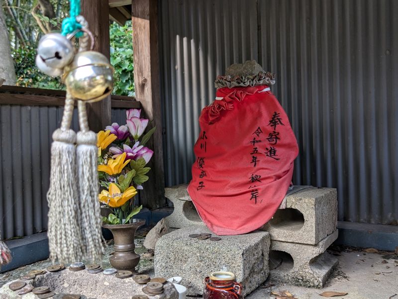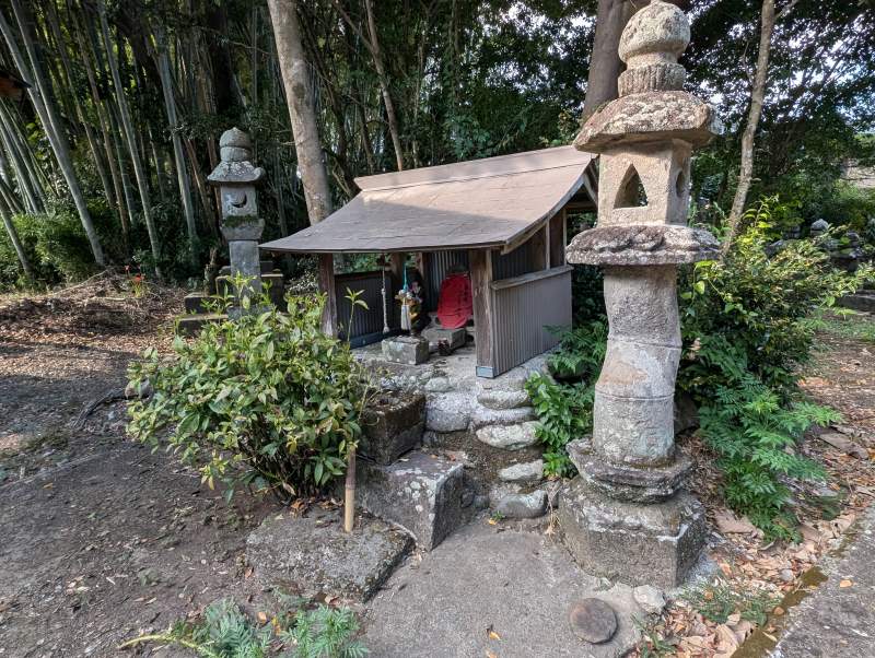 観音堂の左にある小祠が玉垂の塚とされています。現在は猫地蔵が建ち、その右には不思議な形の灯篭があります。これは、寛文年間(1661~1673年)に玉垂のために建てられた灯篭で、猫足になっています。