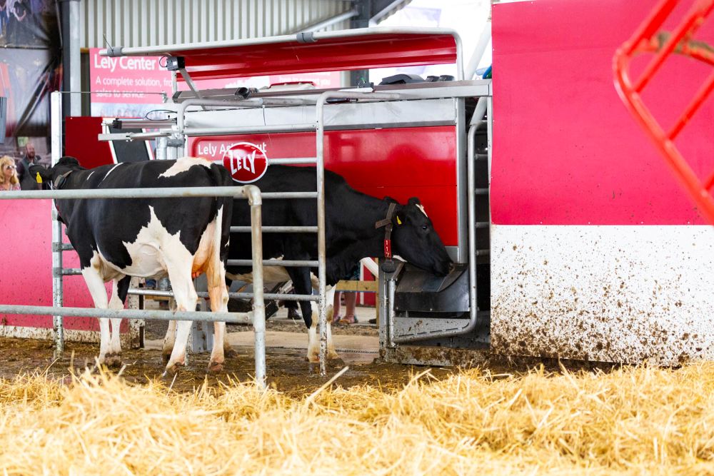 また、大手酪農機器メーカーが、搾乳牛の牧場を会場内に再現した展示も行っていました。フリーバーン方式の牛舎に数十頭のホルスタイン牛が収容され、ロボット搾乳機が設置されていました。このシステムでは人が介在せず、牛たちは牛舎内を自由に歩き回り、搾乳のタイミングになると自らロボット搾乳機に入って自動的に搾乳を受けます。
