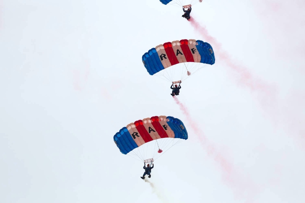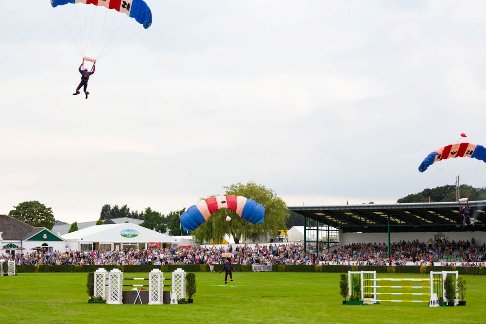 競技終了後に、会場のお客さんが空をじっと見ていると思ったら、イギリス空軍のパラシュート部隊がメインリングに降りてきてたいへん驚きました。