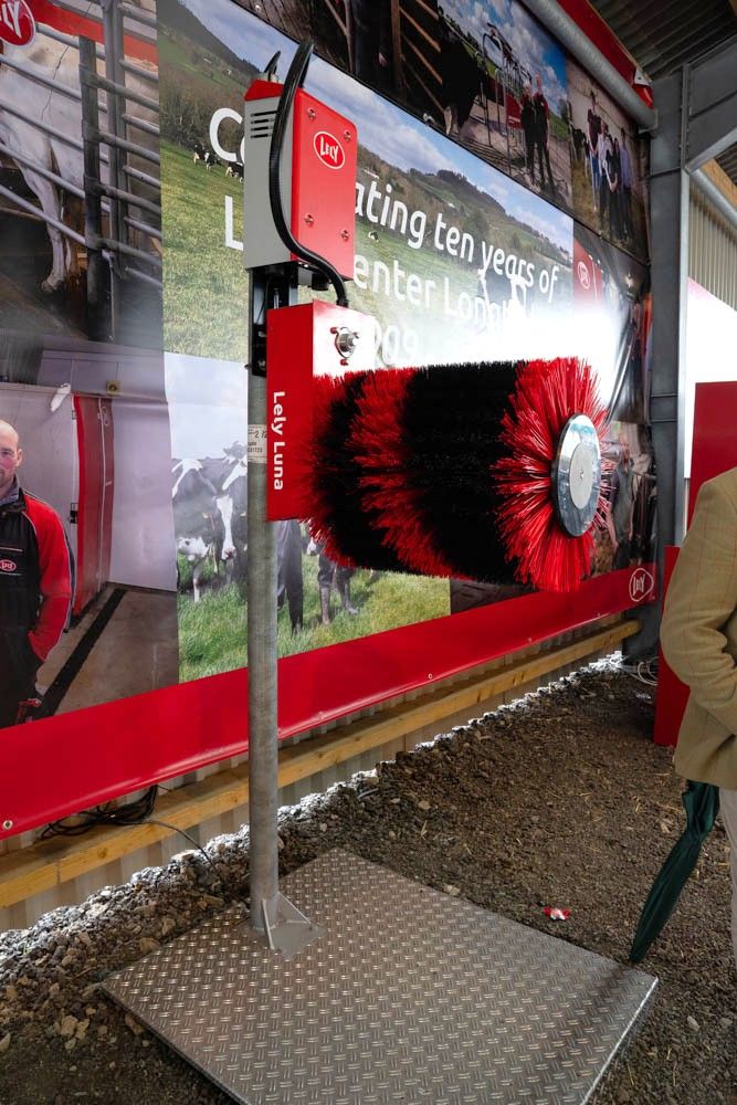 牛舎内には自動回転ブラシも備えられており、一般的な規模のフリーバーン農場を会場内にそのまま持ち込んだような構成で、最新の乳牛飼養システムを来場者に示す展示になっていました。