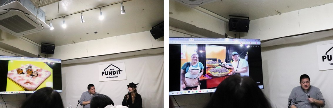 著者の吉田さんと、編集協力者のムシモアゼルギリコさんが登壇した同イベントには、20名ほどの昆虫食ファンらが集まり、和やかな雰囲気のなか、書籍化にまつわるエピソードや吉田さんが昆虫を食べに訪れたザンビアや中国での映像が披露されました。書籍におさまりきらなかった滞在の苦労話や、現地メディアに取材された経験などのディープな裏話もあり、既に書籍を読んだ参加者にとっても興味をそそられる内容でした。