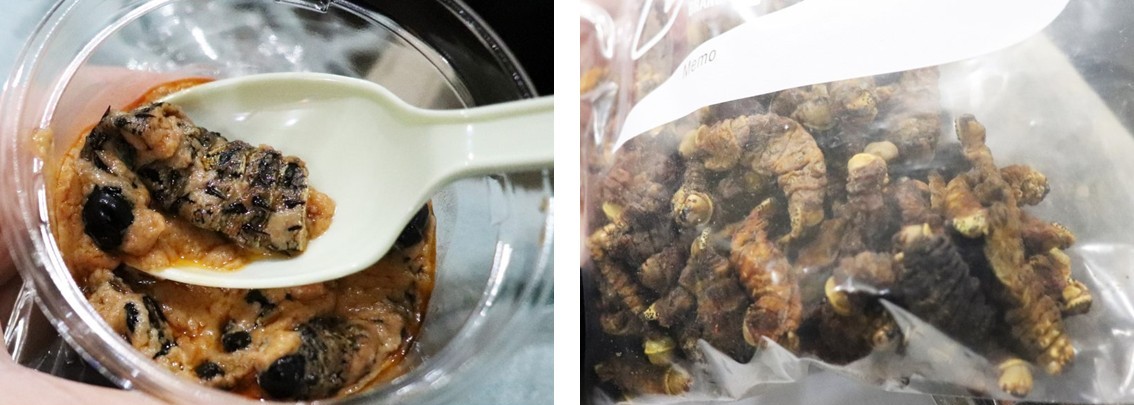 来場者には、吉田さんがザンビアから持ち帰って調理した「モパネワームのおつまみ」がふるまわれました。モパネワームは書籍にも登場しているガの幼虫で、アフリカ南部を代表する食用昆虫です。現地では、中身を絞った後の外皮の部分を焼き、天日干しにしたものが流通しています。