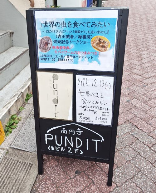書籍『世界の虫を食べてみたい 幻の「ミツツボアリ」と「素数ゼミ」を追い求めて』の著者・吉田誠さんによる発刊記念トークショーが、12月13日にイベントハウス・高円寺パンディットにて開催されました。