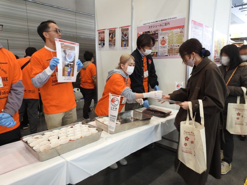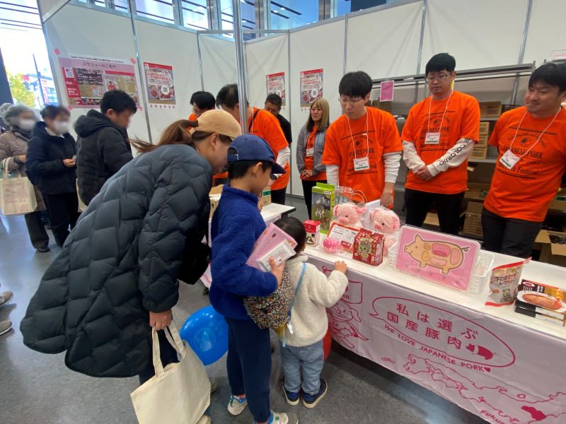 また、国産純粋種豚改良協議会がブースを出展し、認定銘柄豚の試食イベントを初めて開催しました。試食と同時に、オンラインのアンケート参加チケットを配布しており、回答者にはオリジナルグッズの贈呈と、抽選で10名に認定銘柄豚の精肉、または加工品を後日送付するとのことでした。