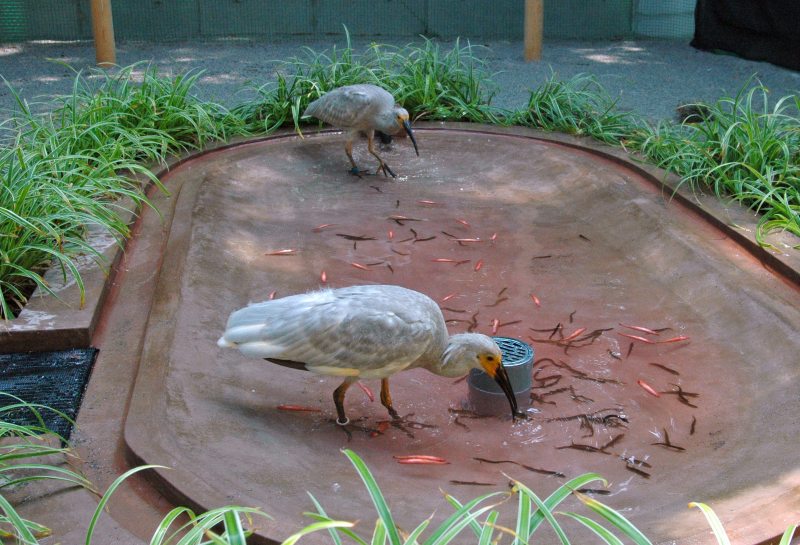 当園では、朝9時ごろ、飼育員が公開ケージの「トキ里山館」の浅い池に生きたドジョウを放します。すると、トキたちは目を輝かせて泥の中にくちばしを突っ込み、ドジョウ探しに夢中になります。