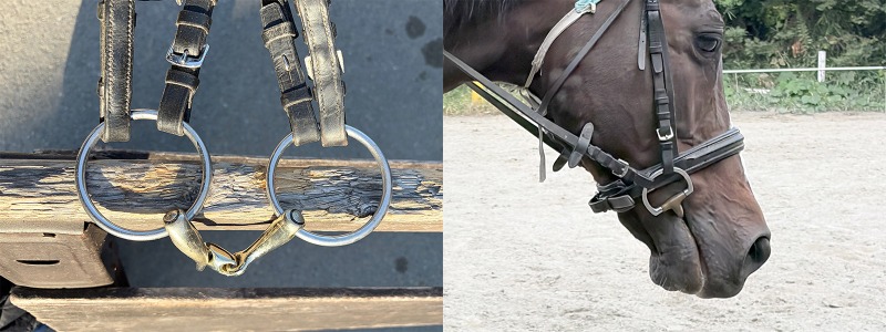 一般的な水勒銜(すいろくはみ)はジョイント付きで、両側の輪の部分に手綱がつながります。手綱を引くと、ハミが舌と歯槽に圧力をかけ、口角にも作用します。輪の形状も丸いもののほかに、卵のような形、Dの字などの種類があります。ハミは馬とコミュニケーションを取るための、とても大切な道具です。