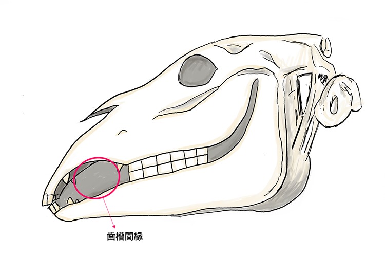 ハミは馬の口にくわえさせる棒状の金具です。馬の口には下図のように歯のない部分(歯槽間縁)があり、ちょうどこの部分にハミが収まります。