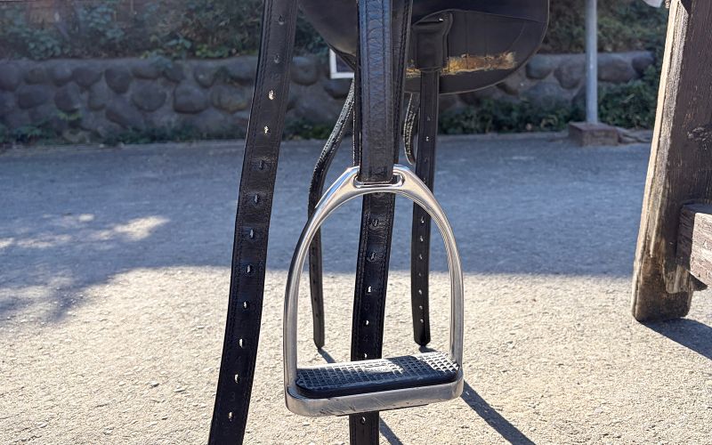鐙は鞍の両側に吊り下げて、ライダーが足を乗せてバランスを取るための馬具です。ライダーの体重を支え、立ち上がったり前傾姿勢を取ったりする際の支点となります。適切な長さに調整することで、安定した姿勢を保つことができます。