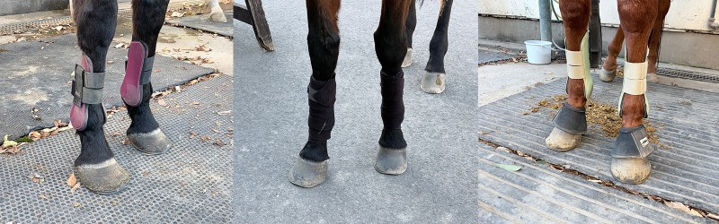 馬の脚は細く、腱や靭帯を傷めやすいため、運動内容に応じてプロテクターなどを使用します。プロテクターは、特に腱部や球節などを保護します。バンテージは布で脚を巻いてサポートする道具です。