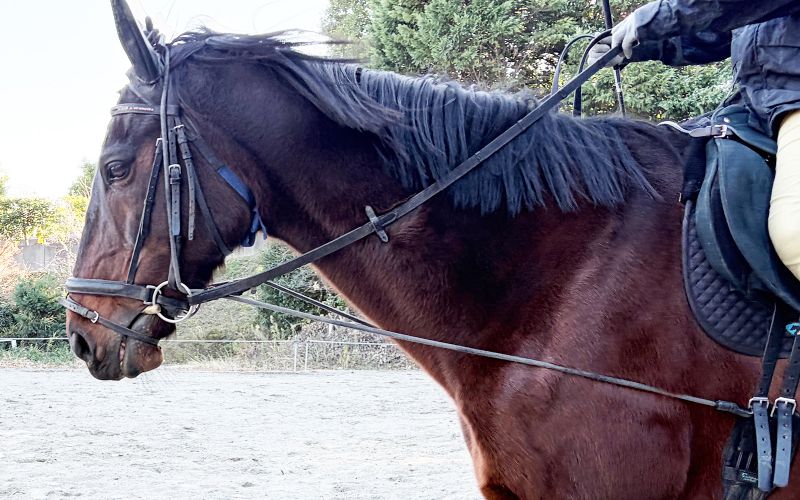 手綱はライダーが手で持つロープのようなもので、頭絡についたハミの両端につながっています。手綱からハミを通じて、馬に進む方向やスピード、停止などの指示を出すことができます。