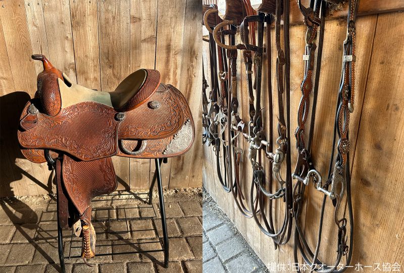 ウエスタン馬術では、長時間の牧場作業に由来した馬具が使われています。