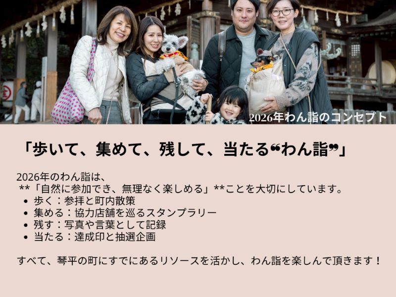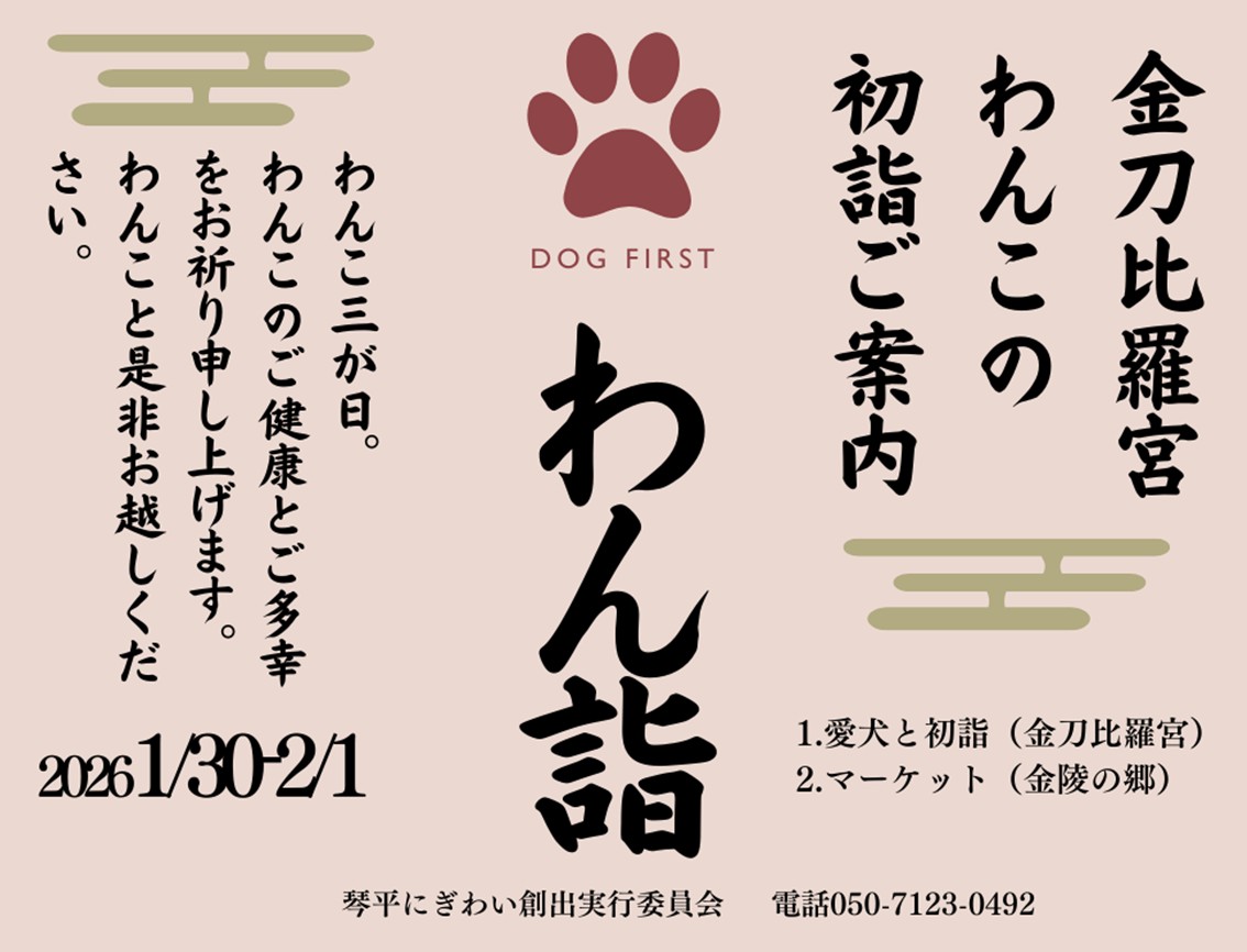 琴平町にぎわい実行委員会は、香川県琴平町金刀比羅宮周辺にて「2026年 わん詣〜わんこの三が日〜」を2026年1月30日~2月1日に開催します。