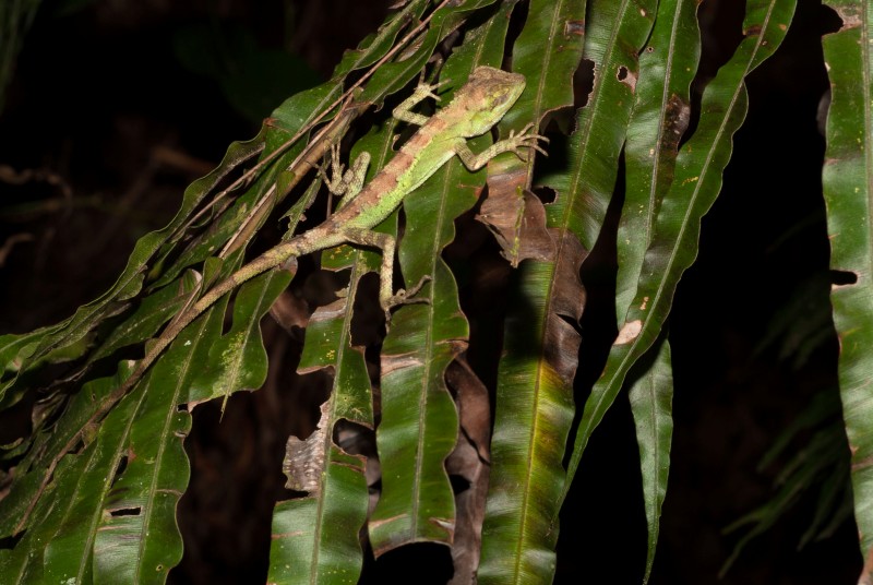 しかし、そんなトカゲにも弱点があります。昼行性のため、夜間は眠ります。木の上で寝ていると寝込みを襲われる可能性が高いため、機転を利かせて葉の先端で寝ている姿を見かけます。これは、敵が木を伝って葉に来た時の振動で目を覚まして逃げる、という戦略です。念には念を入れながら、巧みに生き残ってきたすべの一つです。寝ているところを見つけても、そっとしておいてあげてくださいね。