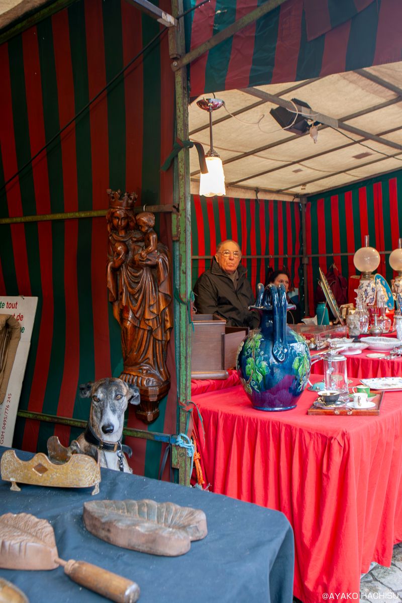 朝9時になると、広場は活気に満ち始めます。広場を囲むように設置された赤と緑のカラフルなテントが開き、アンティークショップの店主が花器やお皿を並べてオープン準備を始めます。そのすぐそばには、用意されたベッドに座るスパニッシュ・グレーハウンド。非常に穏やかな女の子で、お客さんが目あての品を探している様子をじっと見つめていました。そんな賢い犬を見ていると、店主が「Belle(ベル:美しいの意)と名前を呼んであげて」と言ってくれました。「Belle」と呼ぶと、カメラのほうを見てくれて、朝から幸せな時間だなと感じました。