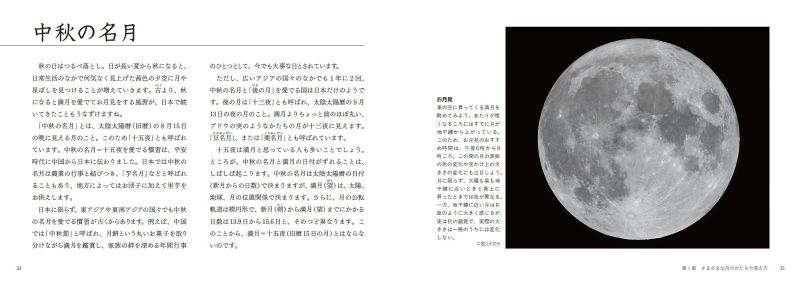 第1章「さまざまな月のかたちや見え方」から第2章「月を科学する」にかけ、月のいろいろな見え方や天体としての月の特徴を、科学的に解説します。第3章「月と人のかかわり」では、「七夕」の行事といった月にまつわる伝統や、月が登場する神話や伝承、月がモチーフになった詩歌や映画などを紹介します。第4章「月探査の歴史」と第5章「月探査の未来」では、1950年代から現在までの、人類の月探査の歴史や発見を紹介します。