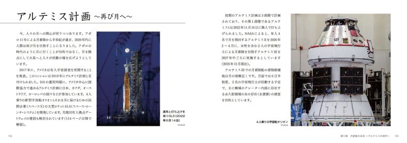 人類は再び月面へ降り立とうとしています。アメリカが主導する国際プロジェクト「アルテミス計画」がその代表です。1960~1972年にかけ実施されたアポロ計画で、人類は初めて月面に降り立ちました。時を経て、2019年に発表されたアルテミス計画は、単に月に向かうだけではなく、月を拠点とした火星への探査も視野に入れた、より壮大なプロジェクトになっています。また、アルテミス計画のような国際プロジェクトだけではなく、民間企業も月への探査や民間旅行の実現を目指し、積極的に開発を進めています。そういった、人類の挑戦の「現在地」も、本書でたしかめてみてください。