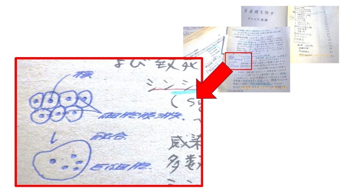 私が獣医大生初年次だったころ、微生物学講義を受講中に黒板に描かれた図を何気なく模写しました。その図は、レトロウイルス感染が細胞融合させる「合胞体化」という現象を示すものでした(図1)。