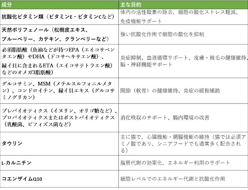 緑イ貝や魚油由来のEPA/DHAは、シニアフードでよく採用されている必須脂肪酸で、抗酸化と炎症抑制に寄与します。オメガ3脂肪酸やオメガ6脂肪酸(リノール酸とアラキドン酸など)のバランス設計は、シニアフードでもよくみられます。