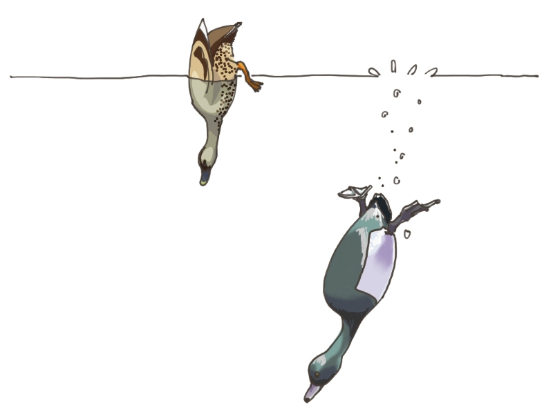 先ほど紹介した「水陸両用タイプ」のカモたちは、水中にどっぷり潜ることはあまりしません。では、水底に生えているエサ(水草など)をどうやって食べるのでしょうか?