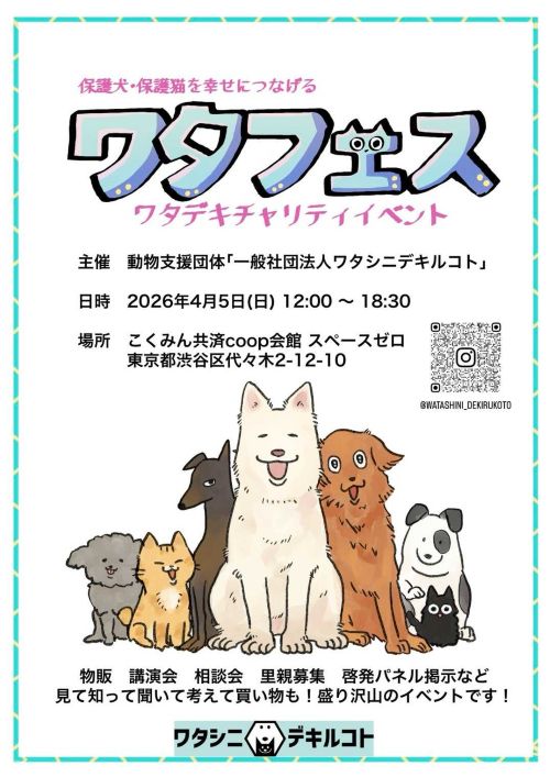 動物支援団体ワタシニデキルコトは、こくみん共済coop会館にて「ワタフェス ワタデキチャリティイベント」を2026年4月5日に開催します。