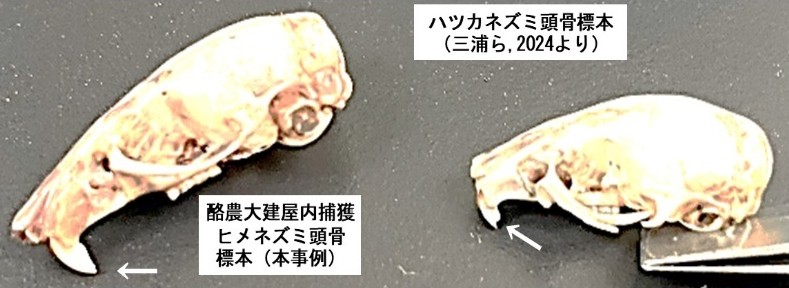 臼歯ばかりの話でしたが、ネズミなら特徴的な切歯(前歯)は出なかったのかと不思議に思ったのではないでしょうか? 実際、この試料から切歯はほとんど見つかりませんでした。頭骨にごくわずかに付いていたモノはありましたが、それを見る限りアカネズミ類でした。しかし、この事実はとても大切で、「アカネズミ類のうち、ヒメネズミと骨格が似ているハツカネズミが、縄文時代の森町では認められなかった」という事実の裏付けを補強するものになりました。両種の特徴は、切歯の形態で鑑別可能です(図3)。