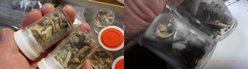 今回のアカネズミ類臼歯は、二股に棘のような突起(歯根)が見えました。一方、ヤチネズミ類にはこういった形の歯根は見えません。これは、今回のヤチネズミ類の多くが比較的若い個体であったことも示しますが、少なくとも今回溜糞とされた試料には2群の野ネズミ由来の骨が含まれていたことはわかりました。
