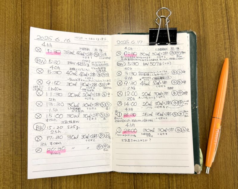 その日の体重や体調、「こうすればうまく飲んでくれるよ」など、些細な事まで書き込んでいました。