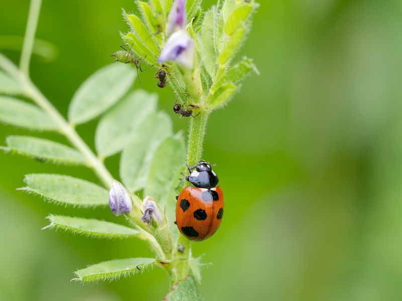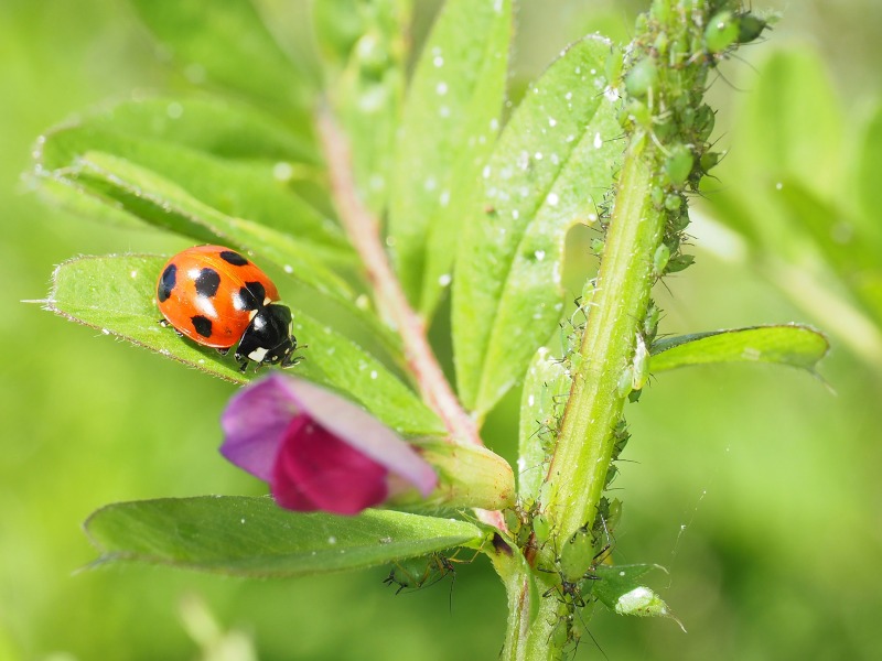 ナナホシテントウは成虫、幼虫ともにアブラムシを捕食することでよく知られており、成長時には蛹の時期がある「完全変態」の昆虫です。