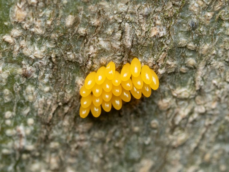 越冬を終えた成虫が春に目覚めると、植物についたアブラムシを活発に捕食し、やがて交尾や産卵を始めます。卵は淡黄色の小さな粒で、長さ1ミリメートルほどの紡錘形(ぼうすいけい/つむがた)をしており、アブラムシの集まる植物の葉の裏に30個ほどまとめて産み付けられます。孵化までの日数は2~7日程度(平均的には約2~3日)で、気温が高いほど成長が早まります。