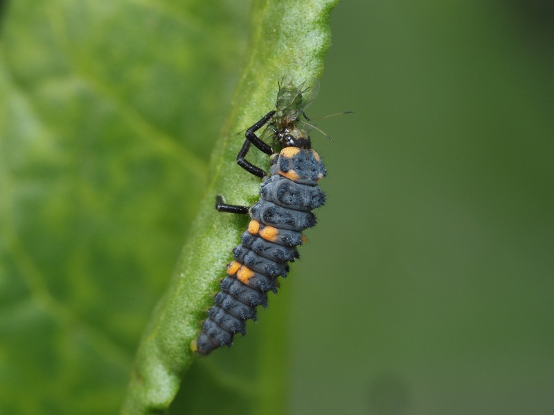 孵化した幼虫は、すぐに歩き回ってアブラムシを捕食します。幼虫は黒〜暗灰色の細長い姿に頑丈な脚をもち、全身にイボのような突起があります。背中側にはオレンジ~黄色の斑紋があり、よく目立ちます。
